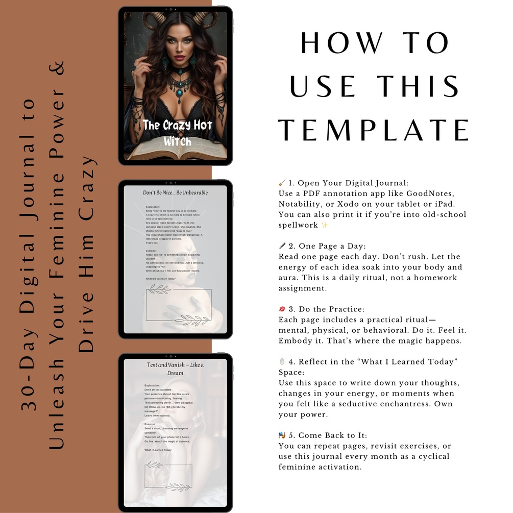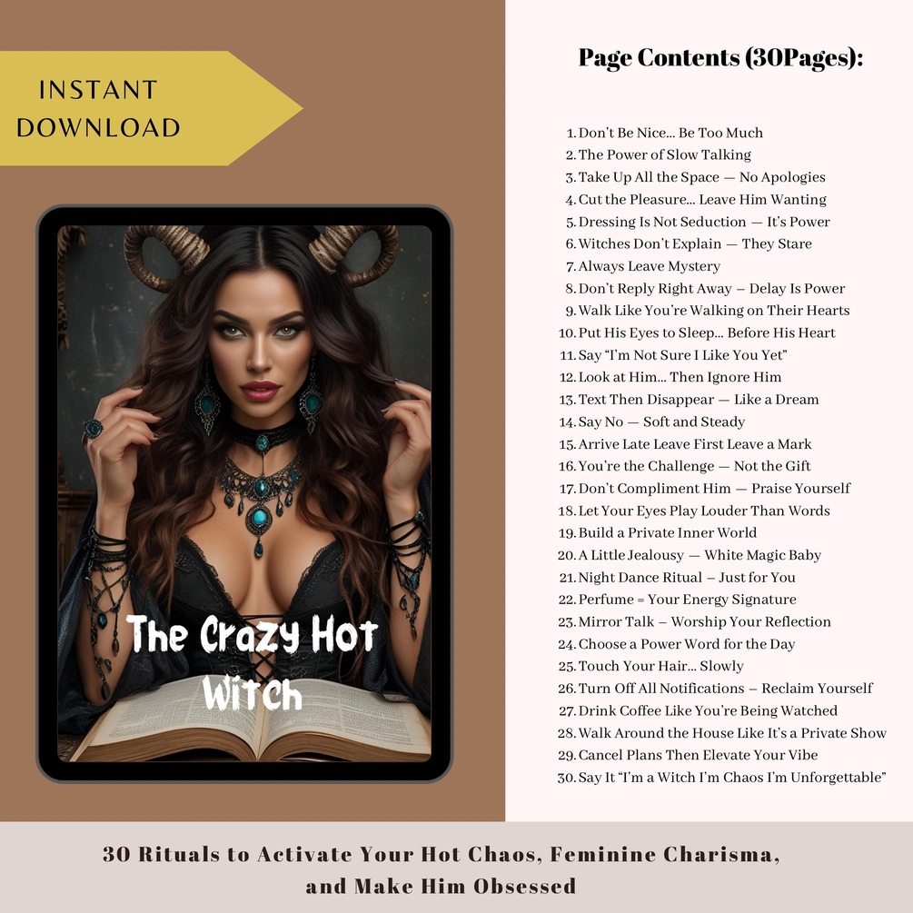 Unleash your inner seductive chaos with The Crazy Hot Witch, a bold and unapologetic 30-day digital journal designed to help you activate your feminine magnetism, master emotional elegance, and leave a lasting impression in every room you enter (and in every man’s mind you walk through).